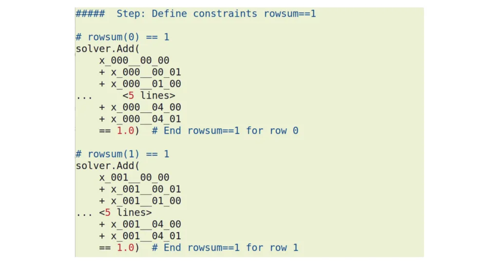 In this problem formulation, the loss function corresponds to the total shipping cost, the first constraint ensures that valid binary decisions are made, and the second constraint ensures that exactly one carrier is assigned to each order. This problem is somewhat trivial because it is separable – each order can be optimized in isolation by choosing the least expensive carrier. This can be done without invoking any advanced optimization algorithms.