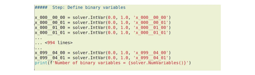 By no means do we claim here that this concrete dimensionality boundary has any universal meaning and reflects some limitations of the underlying engine. The boundary is likely to be due to some peculiarity of the Python compiler itself and it is likely to change if we use other programming interfaces available for OR-Tools, e.g. C++ or C#. Nevertheless, in our experience, methods of regular optimization like MIP are prone to fail when dimensionality of the optimization problem becomes large enough.